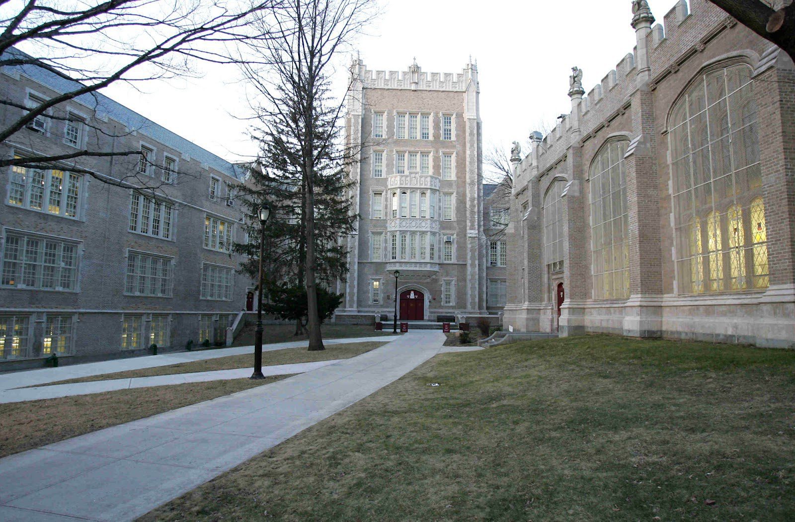 Its structure resembles a castle. Neo-Gothic towers with gargoyles rise above the campus. Once inside, the school takes on the appearance of a grand cathedral. The upper level of the balcony is adorned with columns and arches, while large chandeliers hang from the ceiling and wide stained glass windows impart a monastic ambiance. The vaulted ceilings and the massive decommissioned organ are mesmerizing.
